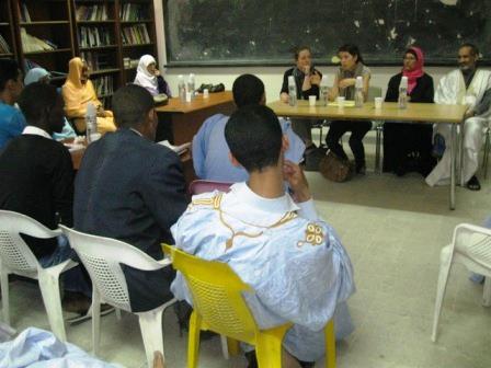 One afternoon, we spoke to two English classes back-to-back. One was at the American corner in a Mauritanian university (American Corners are Embassy-funded areas, like libraries or “corners” of libraries, where we provide American books and other materials for use by locals). Most of the students in the group had a really good command of English and were very vocal and interesting to talk to. The second English class was at the Islamic University in town, where they were equally vocal, but their English level was more basic. It was quite the challenge to remember to speak slowly and in simple sentences! Both groups of students were great – they were really enthusiastic and asked us lots of questions, and even when they touched on some more controversial policy stuff it was very good-natured. Thankfully I’m being afforded the luxury of easing my way into the “answering the tough questions” part of this job!