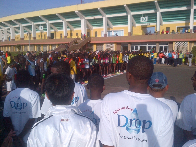 Then everyone trooped back into the stadium for the start of the marathon. The 100 or so runners got to start on the track with a bit more fanfare than their semi-marathon compatriots. There was an emcee with a microphone this time, there was a section for the media (it was empty, but still…), and after multiple announcements imploring the runners to avoid running into a camera that was set up in the middle of the track, the minister of something yelled “go!” into the microphone. Success!